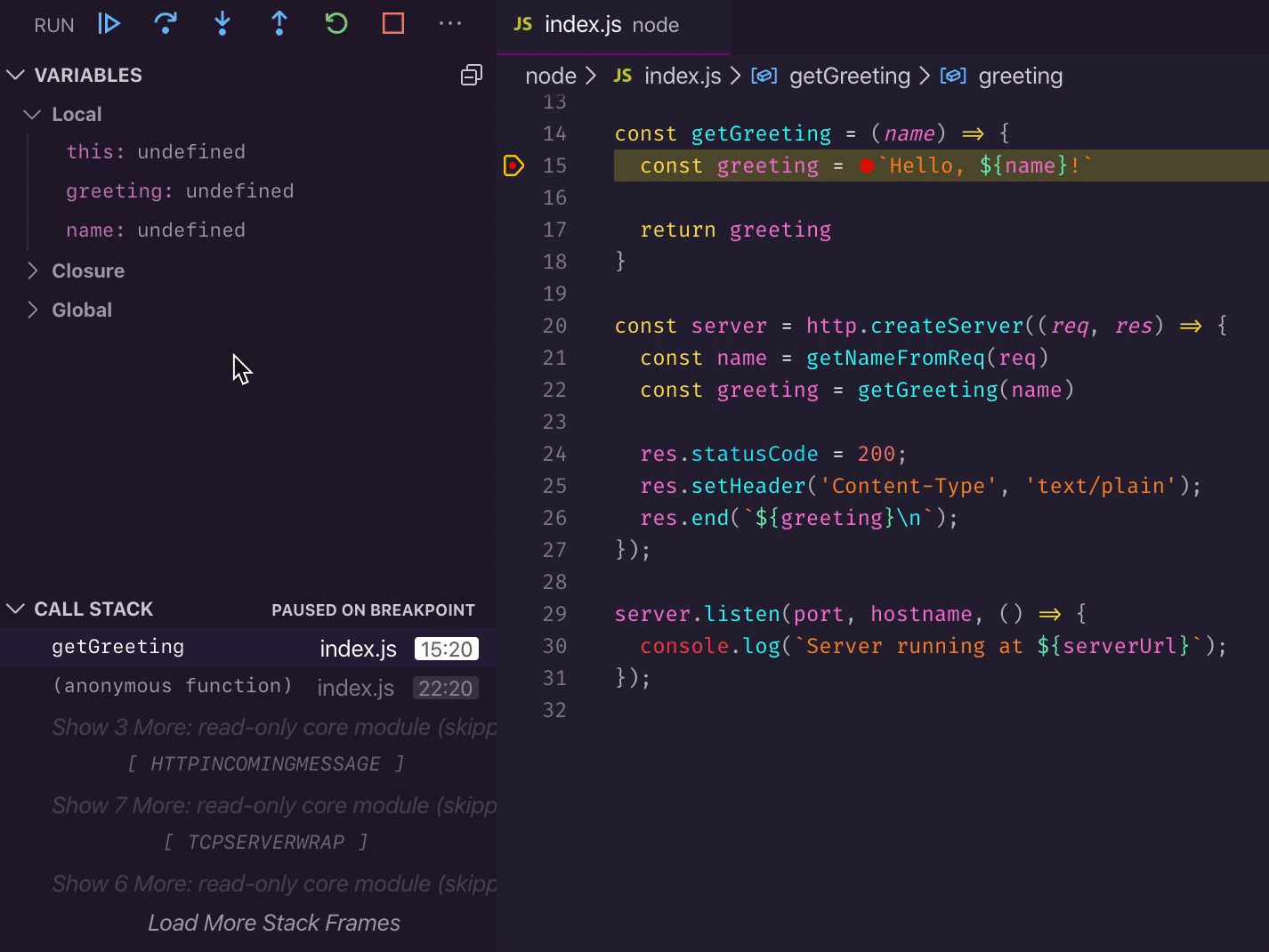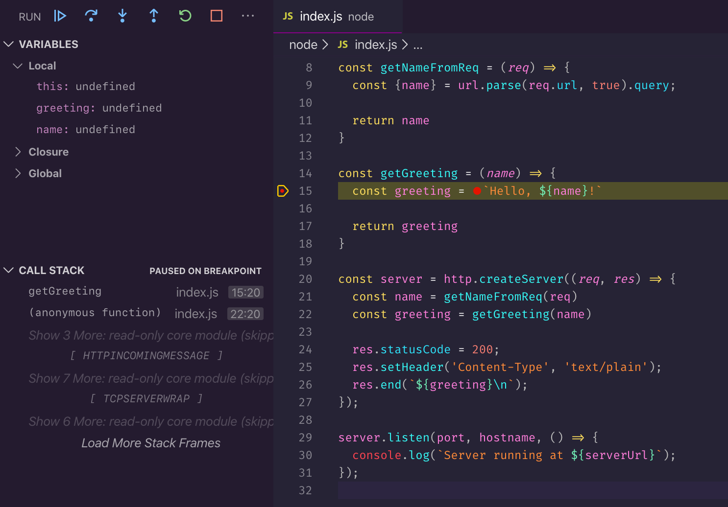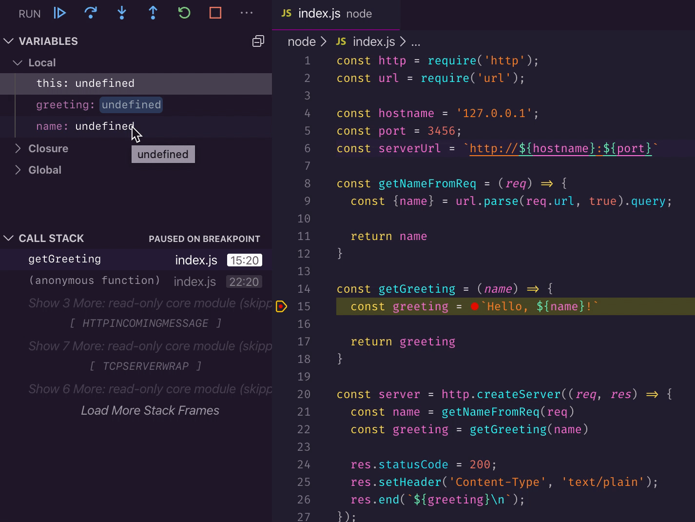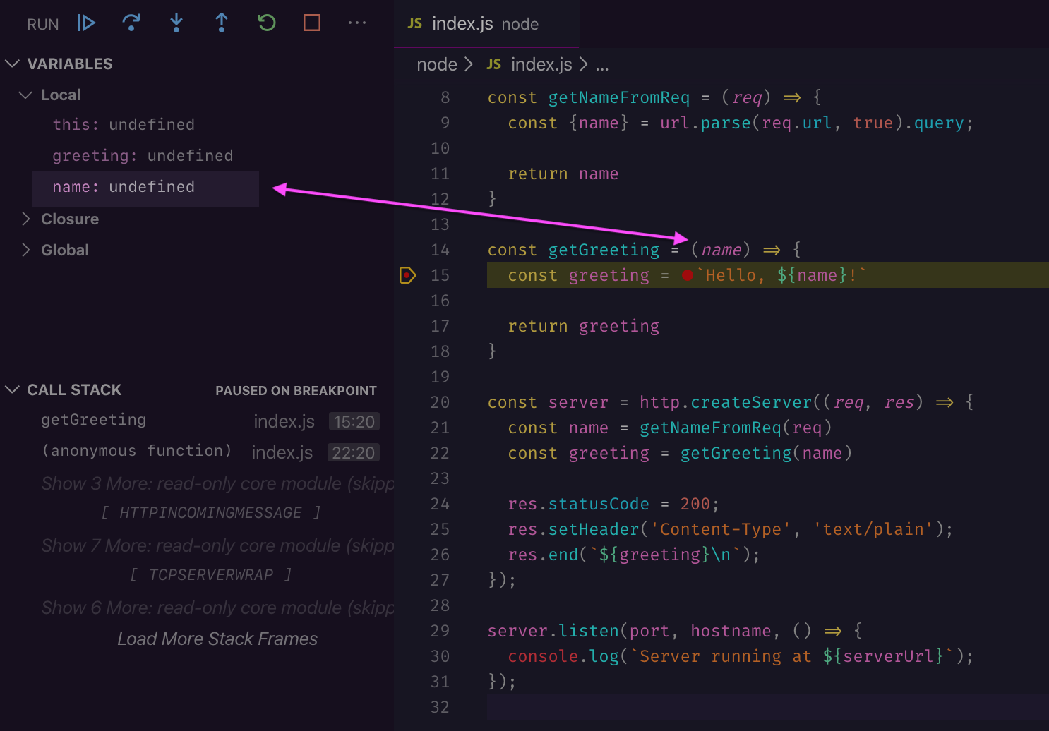 Let's put a breakpoint on line 15 and hit the server without a name query argument (e.g. curl http://127.0.0.1:3456).