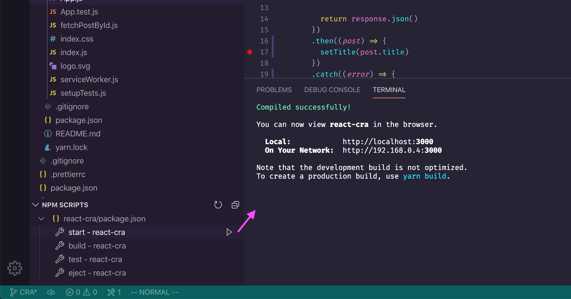 First, you start the dev server in a console with npm start - this can be done in VS Code too by the way.