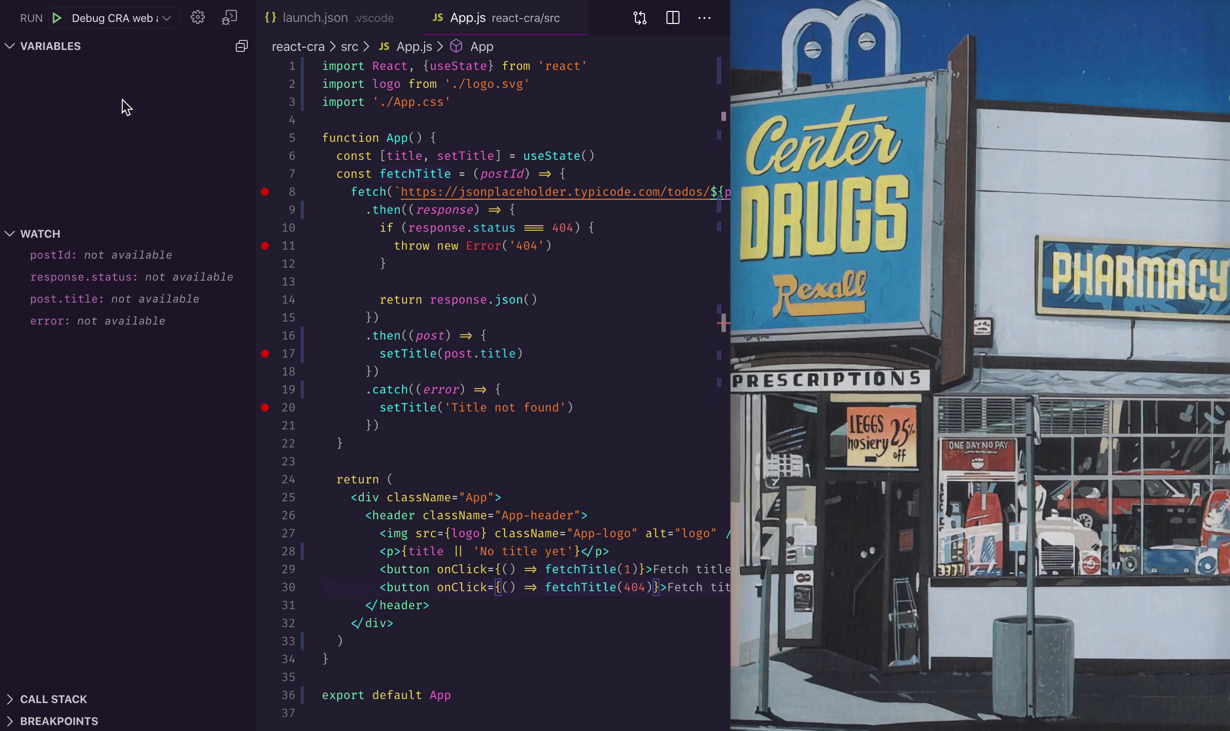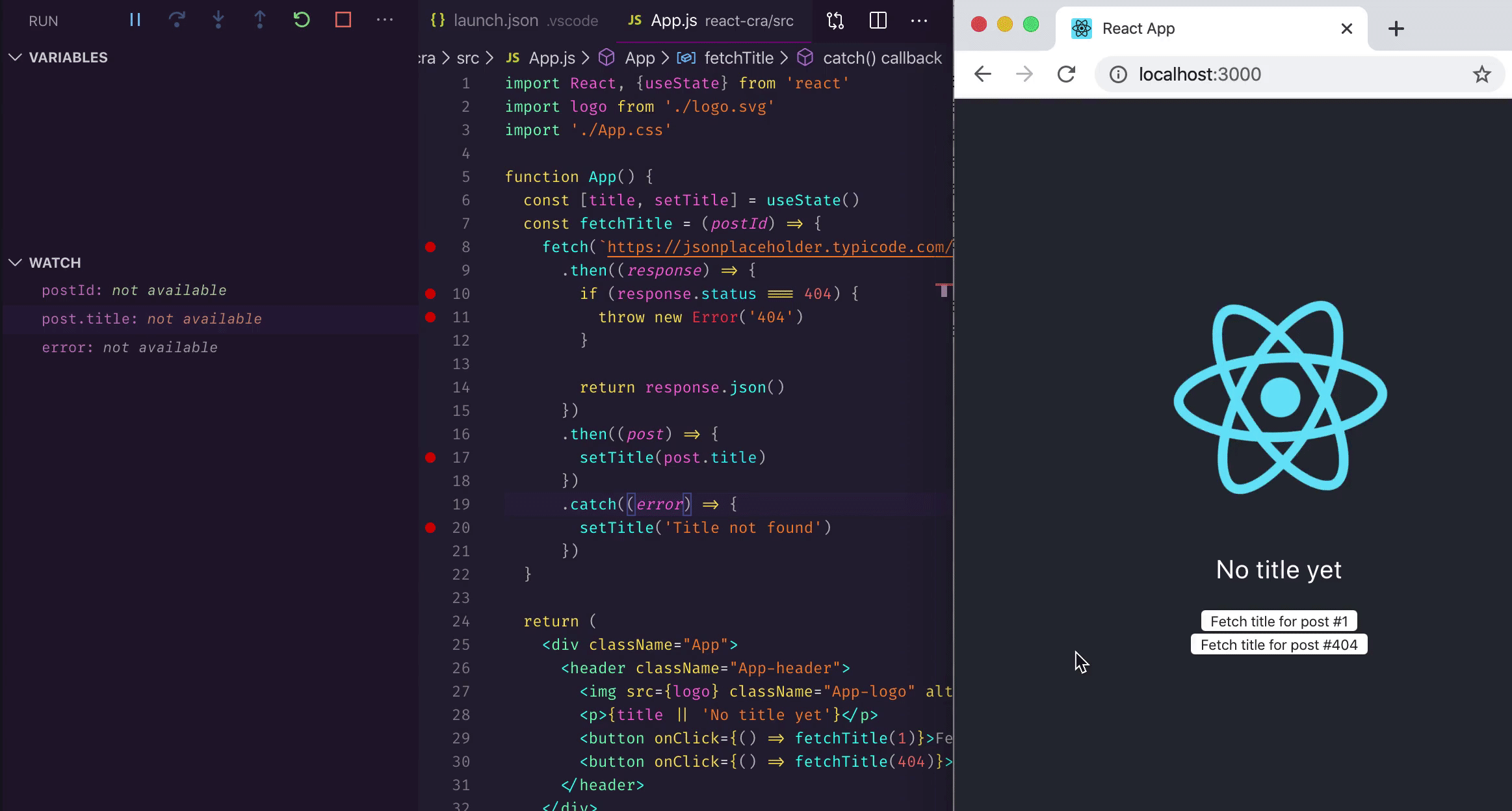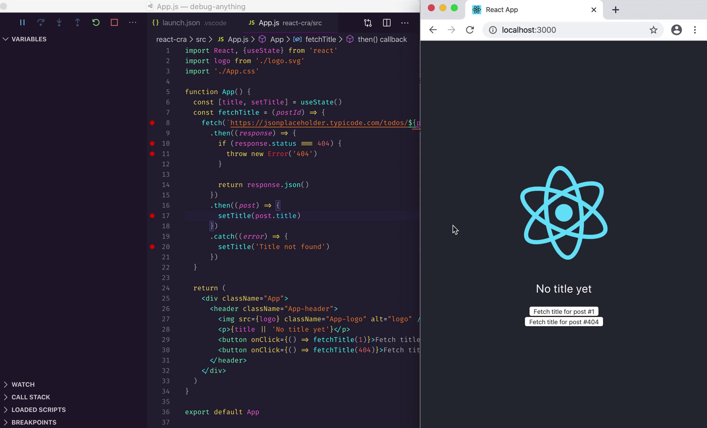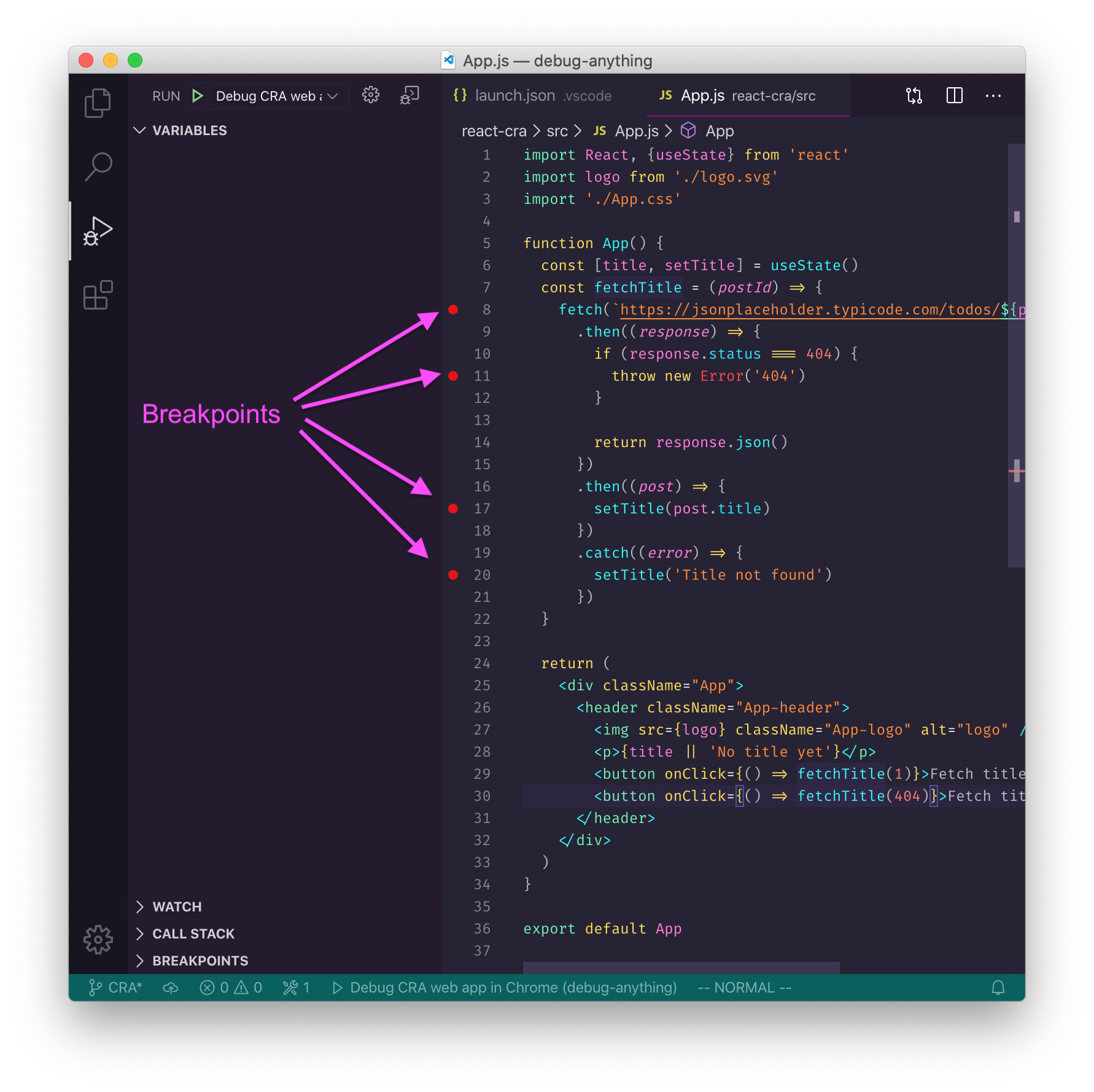launch.jsonto open the app in the debugging browser - Set breakpoints in your source code
